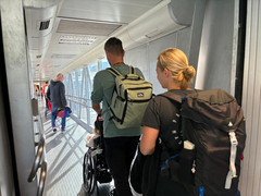 In het begin was het licht chaotisch. Officieel mogen alleen de rolstoelgebruiker en één begeleider met deze medewerker mee, maar omdat wij onze bagage hadden verdeeld alsof we meededen aan een logistieke puzzelwedstrijd, kreeg ik onmogelijk alles alleen gedragen. Gelukkig mochten de rest van de troepen uiteindelijk ook “meeliften”.